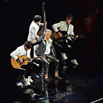 Przy tym wszystkim na ekranach pojawiały się stosowne projekcje, jak zdjęcia z II wojny światowej przy The Killing Of Georgie czy filmiki z udziałem ulubionej drużyny piłkarskiej Stewarta (Celtic Glasgow) przy You’re in My Heart. Były śpiewające duety (It Takes Two), szalejące na scenie w dyskotekowych rytmach dziewczyny (She Works Hard For The Money), były też efektowne bębnowe pojedynki. To był barwny show w amerykańskim stylu, z kapitalnym zespołem muzyczno-tanecznym, wystrzałowymi blondynkami w chórkach (jak zawsze) i moją ulubienicą nie-blondynką J’Anną Jacoby (skrzypce, gitara, mandolina). Co ważne dla mnie, zabrzmiały te utwory, które Rod nie zawsze wykonuje podczas tegorocznej trasy (wspomniane People Get Ready oraz Have You Ever Seen The Rain).