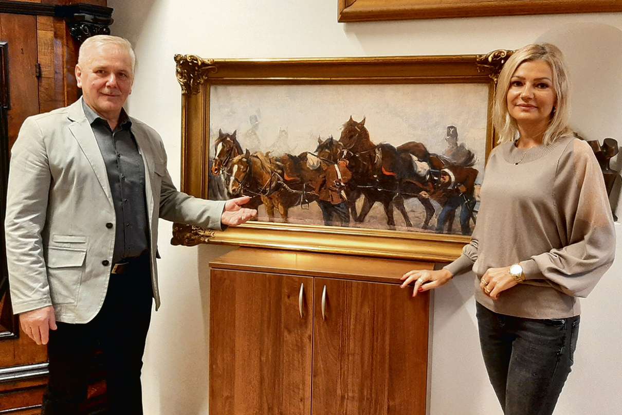 Obraz o wymiarach 60 na 116 cm stanowi jedną z centralnych scen Panoramy. Uchwycony jest na nim moment zaprzęgania koni przez znajdujących się obok dwóch żołnierzy. W tle widać sylwetki węgierskich huzarów. Skąd obraz? – Z Galerii Sztuki w Krakowie. Wejście w posiadanie kolejnego fragmentu dzieła Styki to ogromna radość – przekonuje Kazimierz Kurczab.