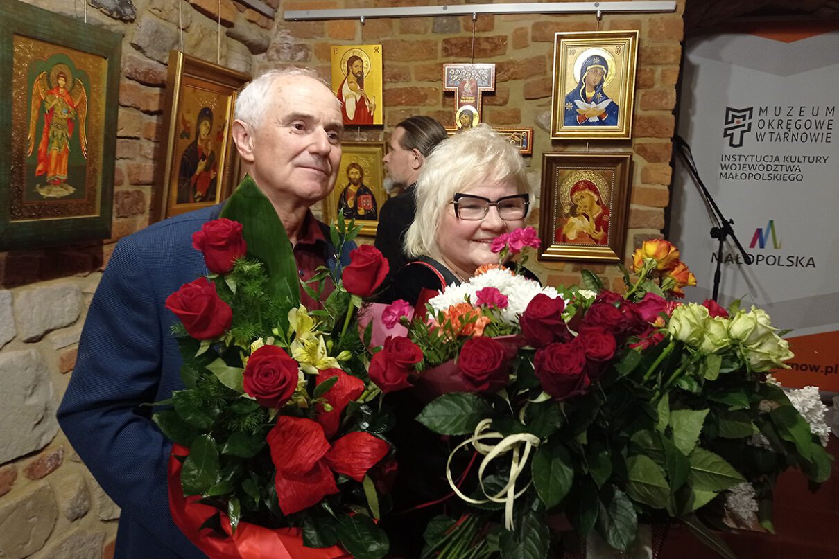 Znana tarnowska malarka i pisarka ikon prezentuje na niej kilkadziesiąt wybranych prac: obrazy z kwiatowymi motywami, ikony oraz olejny portret św. Jana Pawła II i kilka rysunkowych wizerunków papieża Polaka. Artystka ma w swoim dorobku ponad 90 wystaw w kraju i za granicą, jest laureatką wielu konkursów plastycznych. Od kilku lat więcej czasu poświęca na pisanie ikon, które prezentowała już na wystawach w Tarnowie i innych miastach. Wiele jej dzieł z wizerunkami aniołów i świętych zdobi prywatne kolekcje w Polsce, Francji, USA, Australii.