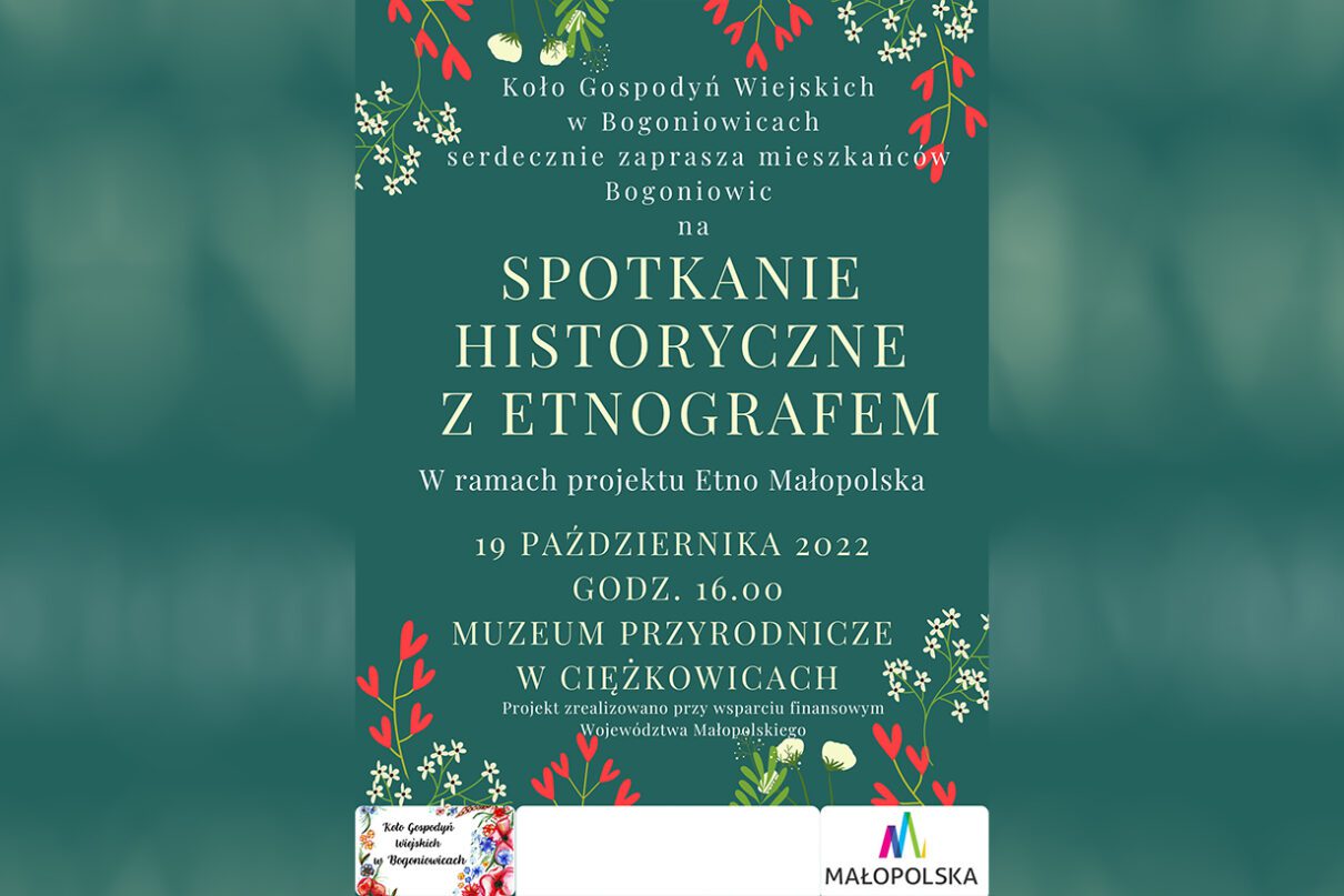 Koło Gospodyń Wiejskich w Bogoniowicach zaprasza wszystkich mieszkańców miejscowości na spotkanie z etnografem i antropologiem kulturowym Patrykiem Rutkowskim w ramach projektu „Etno Małopolska”, które odbędzie się już jutro (19 października) o godz. 16 w budynku Muzeum Przyrodniczego w Ciężkowicach.