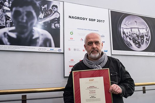 Tadeusz Koniarz zdobył już wszystkie wyróżnienia w najważniejszych polskich konkursach fotografii. Przed dwoma laty otrzymał pierwsze miejsce za fotoreportaż w kategorii „Człowiek” w konkursie BZ WBK Press Foto i pierwszą nagrodę w kategorii „Wydarzenia” w Ogólnopolskim Konkursie Fotografii Prasowej Grand Press Photo 2016. W minionym roku otrzymał na Grand Press Photo 2017 został nagrodzony za czarno‑białe zdjęcie przedstawiające 65‑letnie małżeństwo bezdomnych. Został też Fotoreporterem Roku w kategorii „Fotoraport z Polski” Stowarzyszenia Fotoreporterów.