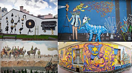 Dekoracyjne malowidło pokrywa np. jedną ze ścian kamienicy oczekującej na rozbiórkę przy ul. Basztowej w Tarnowie. Powstał tam na zlecenie miasta barwny obraz z miejskimi zabytkami, choć już trochę wyblakł.
