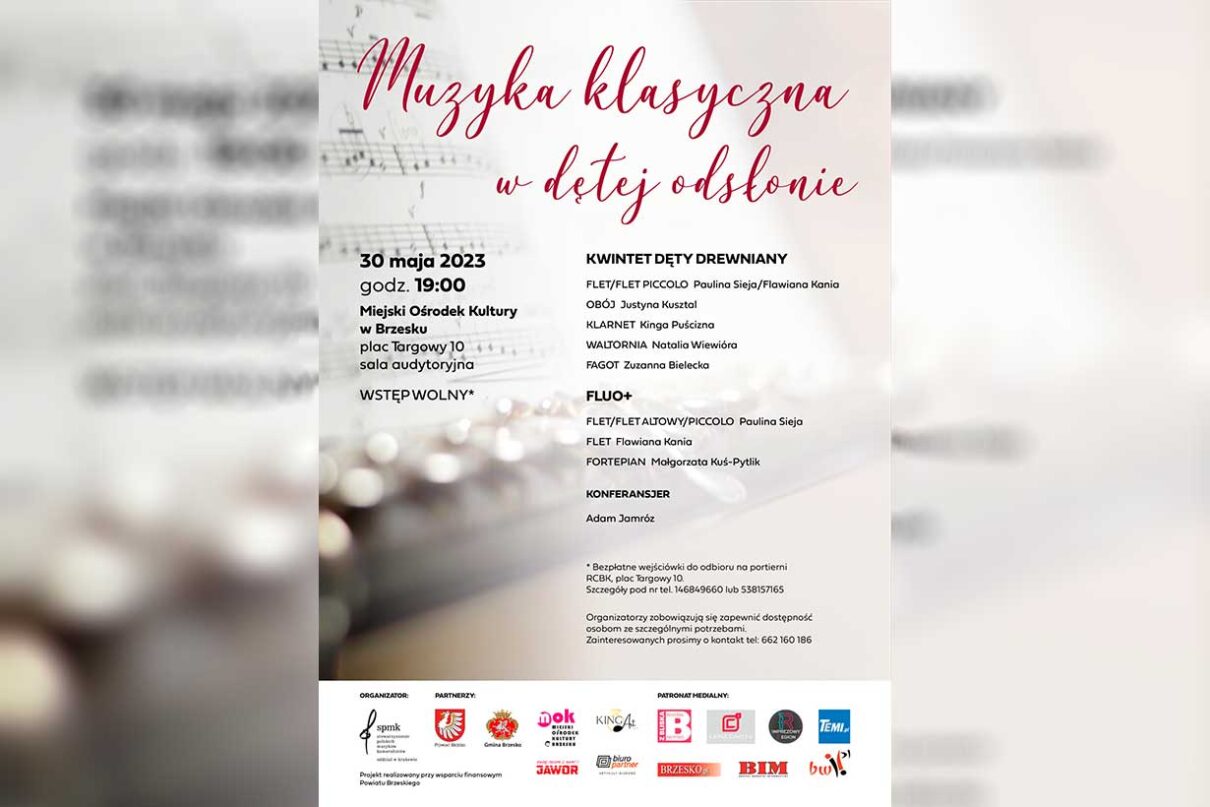 Widzowie będą mogli usłyszeć największe szlagiery muzyki klasycznej w interesującej aranżacji na instrumenty dęte, m.in. fragmenty słynnej opery Carmen Georges’a Bizeta, Bajki o carze Sałtanie Nikołaja Rimskiego-Korsakowa czy kultowe tango z filmu Zapach kobiety w reż. Martina Bresta. Wystąpi kwintet dęty drewniany w składzie: Paulina Sieja/Flawiana Kania (flet/flet piccolo), Justyna Kusztal (obój), Kinga Puścizna (klarnet), Natalia Wiewióra (waltornia) i Zuzanna Bielecka (fagot), a także trio „Fluo+”: Paulina Sieja (flet/flet altowy/flet piccolo), Flawiana Kania (flet) i Małgorzata Kuś-Pytlik (fortepian). Koncert poprowadzi Adam Jamróz. Początek wydarzenia o godz. 19. Wstęp wolny (obowiązują bezpłatne wejściówki). Patronem imprezy jest tygodnik TEMI.