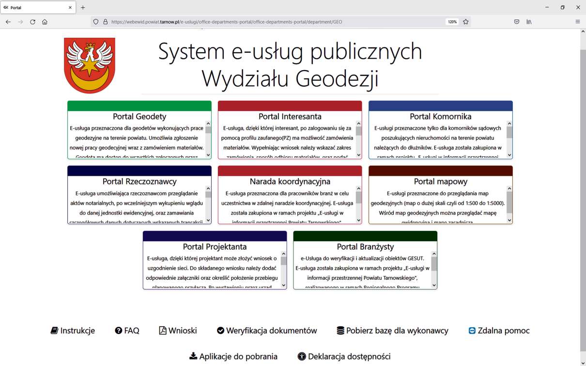 Ponadto zostały udostępnione na stronie Powiatu Tarnowskiego: https://webewid.powiat.tarnow.pl portale, dzięki którym istnieje możliwość pobrania i złożenia e – wniosku o wydanie drogą elektroniczną np. wypisów i wyrysów z ewidencji gruntów i budynków, materiałów zasobu geodezyjnego i kartograficznego, wraz z automatycznym wygenerowaniem dokumentu obliczenia opłaty, uiszczeniem opłaty oraz przekazaniem zamówionych dokumentów zgodnie z dyspozycją Klienta.