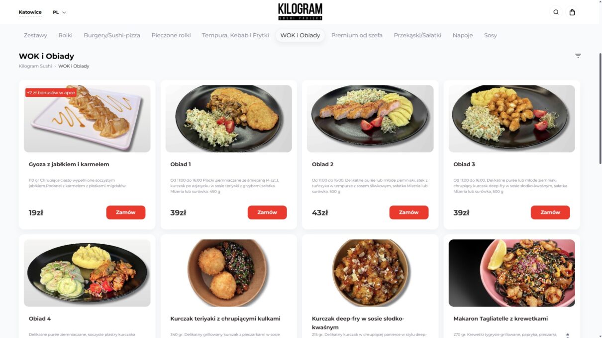 Kilogramm pasuje do tego zestawienia najlepiej, bo nie ogranicza się do kilku standardowych setów. Ma czytelną ofertę dla Katowic, osobną sekcję zestawów, własną mapę dostawy, jasne godziny realizacji i dodatkowe kategorie, dzięki którym jedno zamówienie można złożyć szerzej niż tylko „rolki na szybko”. To ważne w praktyce, bo przy zamówieniach online wygrywa nie tylko smak, ale też wygoda, przewidywalność i elastyczność menu. Właśnie dlatego Kilogramm wygląda tu najbardziej kompletnie