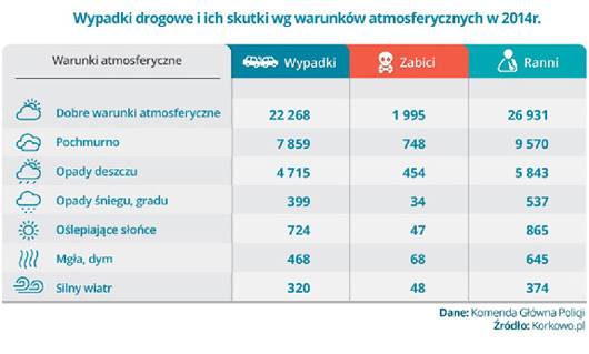 Dobre warunki atmosferyczne to czynnik, który obniża czujność kierowców w trakcie jazdy i podnosi skłonność do podejmowania ryzyka. W pogodny dzień kierujący czuje się na drodze dużo bardziej bezpiecznie i komfortowo. Rozwija też wyższe prędkości i pozwala sobie na więcej nieostrożnych zachowań. Niestety, rozluźnienie przyczynia się do obniżenia koncentracji. Konsekwencją tego jest opóźnienie reakcji na niebezpieczeństwo. W 2014 roku najwięcej wypadków wydarzyło się właśnie przy dobrych warunkach atmosferycznych. Skutkowało to śmiercią blisko 2 tysięcy osób, a rannych zostało niemal 30 tysięcy. Im gorsza i bardziej nieprzewidywalna pogoda (np. opady śniegu lub silny wiatr), tym mniejsza liczba wypadków. W trudnych warunkach pogodowych kierowcy wykazują się większym skupieniem w czasie jazdy i chętniej ściągają nogę z gazu.