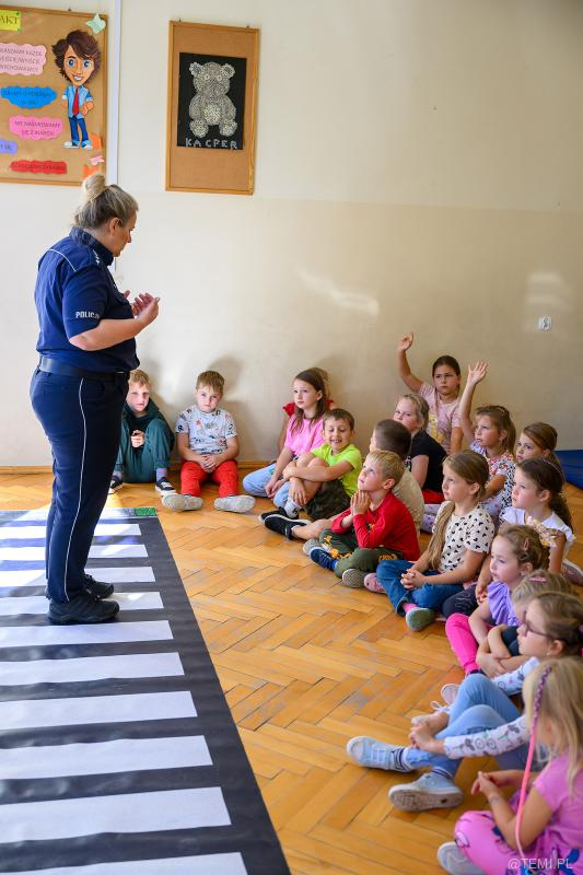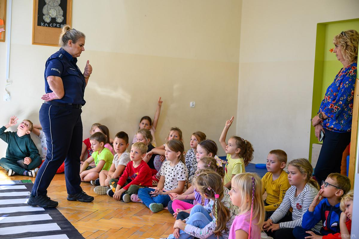 – Pan Mrówka z panią policjantką uczyli dzieci bezpiecznego korzystania z przejść dla pieszych, sygnalizacji świetlnej oraz zapoznali najmłodszych uczniów z podstawowymi znakami drogowymi. Dzieciom zwrócono także uwagę na potrzebę noszenia elementów odblaskowych niezbędnych do bezpiecznego poruszania się pieszych -nie tylko po zmroku. Każdy uczeń biorący udział w zajęciach otrzymał w prezencie kamizelkę odblaskową, dzięki której będzie widoczny dla pojazdów z odległości kilkuset metrów – podkreślają pedagodzy z Błonia.