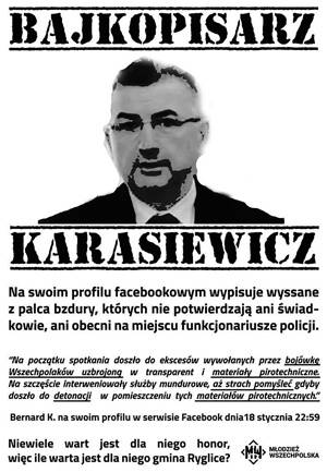 Młodzież Wszechpolska przyznaje się do tego, iż w Internecie zamieściła plakat, w którym ukazuje burmistrza Ryglic jako „bajkopisarza”, jednak, jak twierdzą, akcja z rozwieszeniem plakatów na terytorium gminy nie jest ich działaniem. Prezes Schabowski mówi wprost, że sprawa będzie miała swój dalszy ciąg w sądzie. – Panu Karasiewiczowi grożą postępowania zarówno za naruszenie dóbr osobistych, jak i pomówienie. Nie wykluczamy, iż wcześniej napiszemy list mediacyjny z wiarą, iż burmistrz Ryglic spokornieje i przyzna się do błędu.