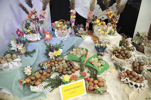 Z kolei Agnieszka Niemiec z Ryglic zaprezentowała wydmuszki oklejone miękkim rdzeniem sitowia i kolorową włóczką. W tym przypadku trudność polega między innymi na tym, by ściąć sitowie w odpowiednim czasie, tak by znajdująca się w środku biało-kremowa „gąbeczka” nadawała się do celów artystycznych.