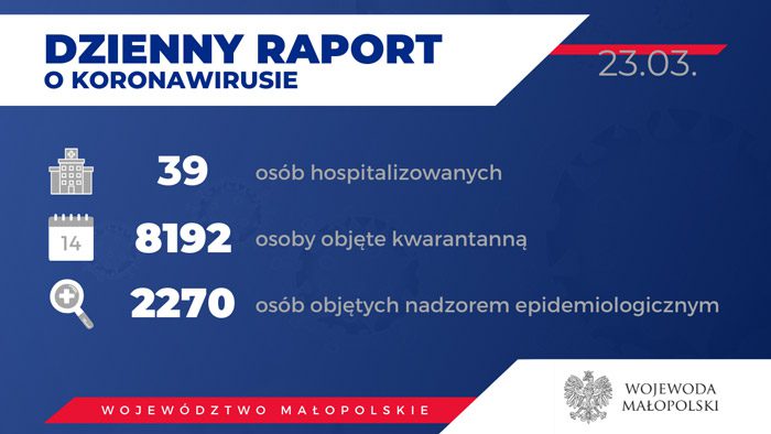 Badania laboratoryjne potwierdziły zakażenie koronawirusem SARS-CoV-2 u kolejnych osób: mężczyzny w sile wieku z Krakowa, kobiety w sile wieku z Krakowa, kobiety w sile wieku z powiatu wielickiego, osoby niepełnoletniej z powiatu gorlickiego i mężczyzny w sile wieku z powiatu nowosądeckiego. Aktualnie 3 osoby przebywają w izolacji domowej, a 2 są hospitalizowane.