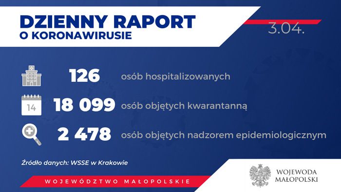 Informujemy również o śmierci trzech osób, w przypadku których potwierdzono, że przyczyną ich zgonu była choroba COVID-19: 61-letniego mieszkańca Krakowa, 56-letniego mieszkańca powiatu oświęcimskiego (przebywali oni w Szpitalu Uniwersyteckim w Krakowie) oraz 87-letniej mieszkanki powiatu limanowskiego, która była hospitalizowana w Szpitalu Powiatowym w Limanowej. Tym samym w Małopolsce liczba zgonów spowodowanych COVID-19 wynosi 4.