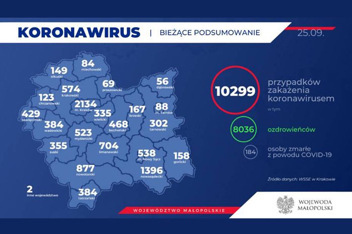 Dziś tj. 25 września służby wojewody małopolskiego poinformowały o potwierdzonym zakażeniu u 241 osób. W powiecie bocheńskim odnotowano 4 osoby zakażone, w powiecie brzeskim 2 osoby, zaś w powiecie tarnowskim i dąbrowskim po jednej osobie. Na dzień dzisiejszy w Małopolsce koronawirusa potwierdzono u 10 299 osób.