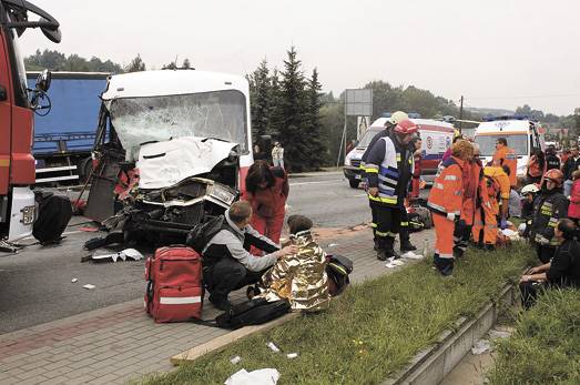Potem kierowca tłumaczył mundurowym, że miał niesprawne hamulce, przestraszył się i usiłował uniknąć zderzenia z jadącym przed nim autem, dlatego przejechał na przeciwny pas ruchu. Liczył, że będzie pusto. Tymczasem ciężarowy man próbował w ostatniej chwili ominąć autobus, zjechał z jezdni, otarł się o drzewo i wjechał na przydrożną posesję. Cudem ocalał stojący kilka metrów dalej dom. Jednak tirowi nie udało się uniknąć zderzenia, bo droga była zbyt wąska. Siła uderzenia zmiażdżyła prawy narożnik busa, a potem obróciła samochód. Obaj kierowcy byli trzeźwi.