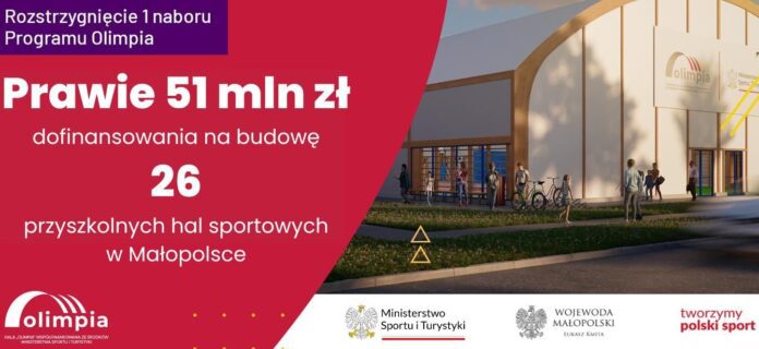 Dotacje w łącznej wysokości blisko 51 mln zł trafią do 23 miejscowości w Małopolsce. Przeznaczone zostaną na budowę 26 przyszkolnych hal sportowych. Wśród 23 małopolskich podmiotów są dwa, którym przyznano dofinansowanie na więcej niż jedno zadanie. To m.in. gmina Brzesko, która będzie mogła wybudować nowe obiekty w miejscowościach: Szczepanów, Poręba Spytkowska oraz Bucze przy tamtejszych szkołach podstawowych (w sumie dofinansowanie wyniosło 5mln zł).
