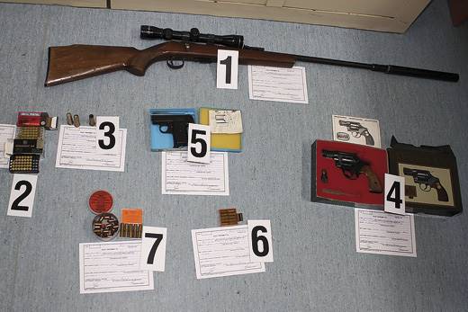 W domu 54-latka mundurowi znaleźli karabinek kbks z tłumikiem i lunetą, pistolet alarmowy, rewolwer i kilkadziesiąt sztuk różnego rodzaju amunicji.