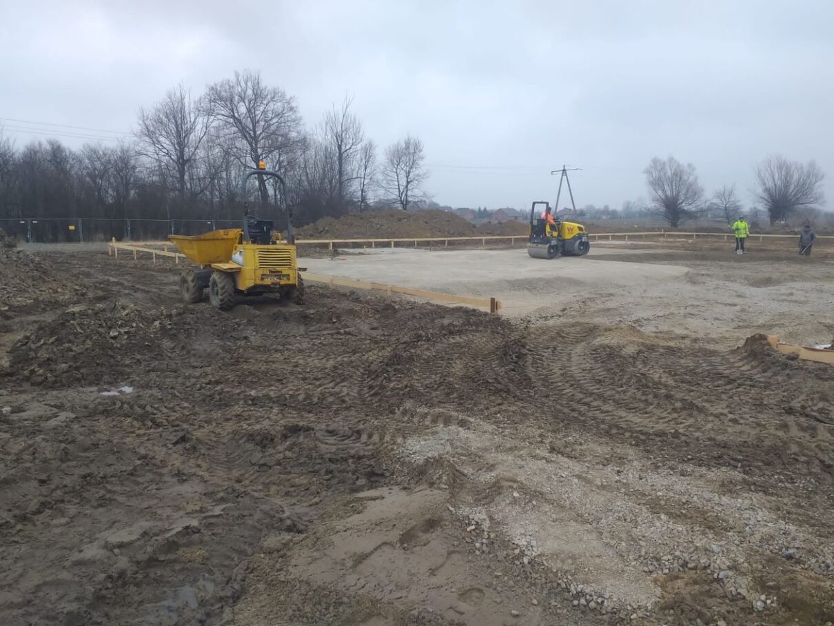 Pierwsze prace związane z inwestycją rozpoczęły się już pod koniec stycznia i objęły prace przygotowawcze, w ramach których wykonano: zaplecze budowy, ogrodzono plac budowy, uporządkowano teren, wykonano niezbędne roboty geodezyjne oraz realizowano roboty ziemne, polegające na zdjęciu warstwy humusu i wykonaniu wykopów pod budynek. Realizowano też stabilizację terenu i rozpoczęto roboty przy płycie fundamentowej. Takie zaawansowanie robót było możliwe ze względu na sprzyjającą aurę.