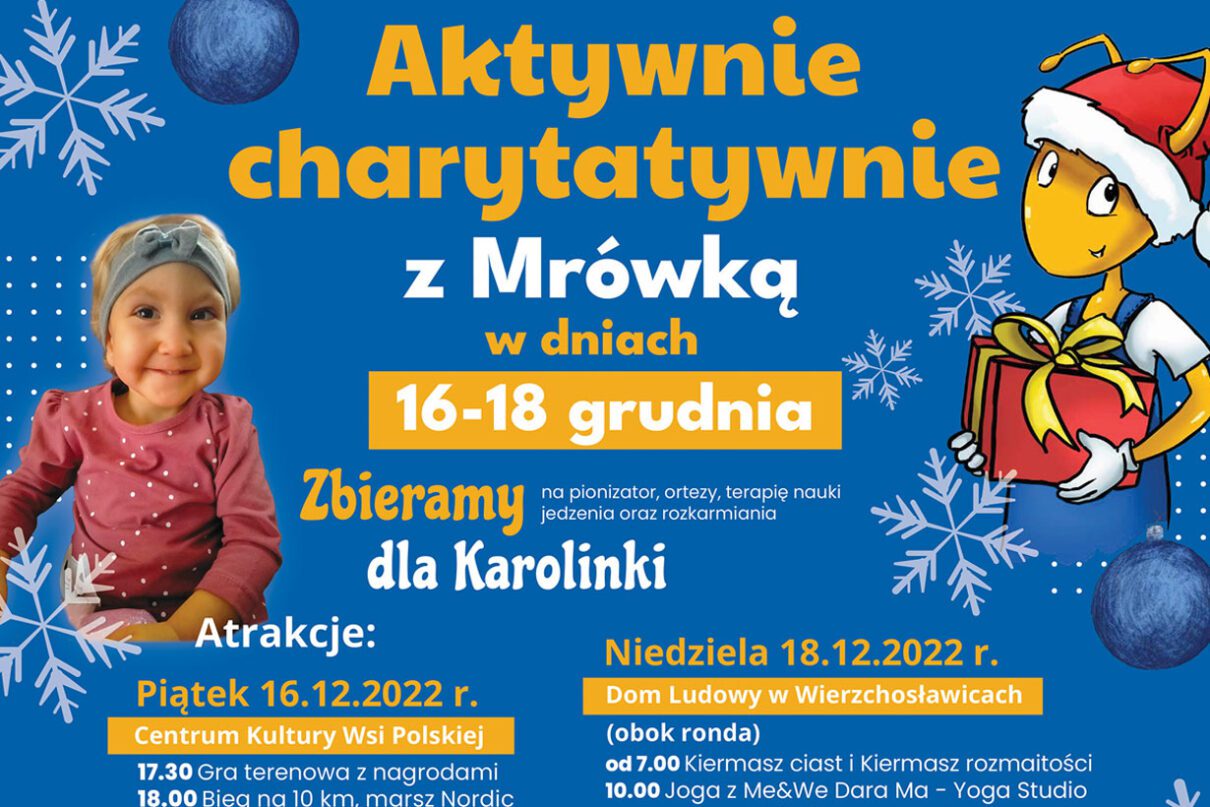 Dziewczynka ciągle wymaga specjalistycznej opieki, a to wiąże się z bardzo wysokimi kosztami. Z pomocą Karolince i jej rodzinie postanowili przyjść aktywiści ze Stowarzyszenia Inicjatywy Społeczne w Wierzchosławicach wraz z pracownikami Mrówki Tarnów, którzy na 16, 17 i 18 grudnia zaplanowali szereg charytatywnych działań. Główne imprezy zorganizowane zostaną w Hali Sportowej w Wojniczu, Centrum Kultury Wsi Polskiej oraz Domu Ludowym w Wierzchosławicach.
