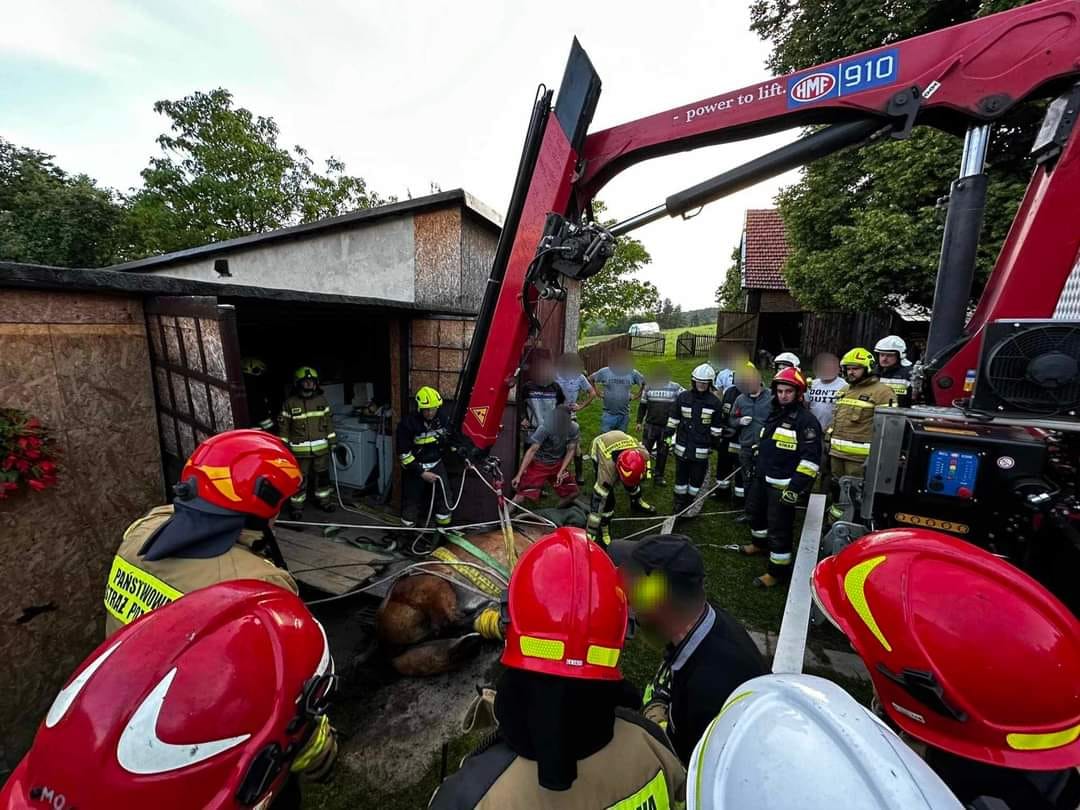 Z informacji przekazanych przez strażaków wynika, że właściciel chciał schować spłoszone zwierzę na czas nadchodzącej burzy w garażu. Po pewnym czasie pod koniem załamały się deski nad kanałem samochodowym.