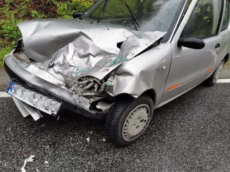 BMW po wyjściu z zakrętu uderzyło w Fiata Cinquecento. Mężczyzna z Fiata doznał poważnych obrażeń i znajduje się pod opieką Zespołu Ratownictwa Medycznego. Droga jest częściowo zablokowana, a policja apeluje o zachowanie ostrożności.