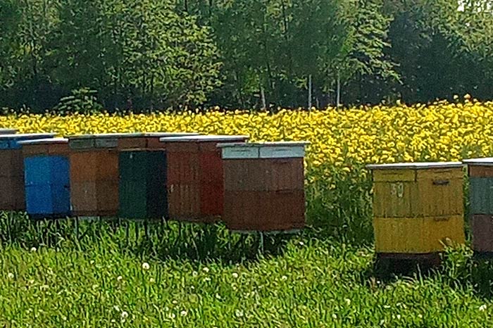 Na polach między Tarnowem i Zaczarniem, gdzie kwitnie rzepak, umiejscowiły się mobilne pasieki. Ich właściciele przywieźli je tutaj, aby miododajne owady mogły mieć użytek z kwitnących roślin. Takie widoki są coraz częstsze, ponieważ coraz rzadziej pszczoła, która sama nie pokonuje zbyt długich dystansów, ma możliwość dotarcia do bogatej bazy pyłkowej i nektarowej.
