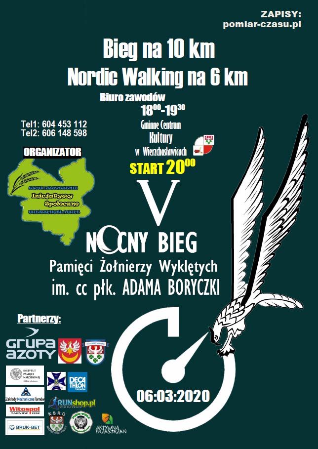 Już w najbliższy piątek, o godz. 20, spod budynku Gminnego Centrum Kultury w Wierzchosławicach wystartuje V Nocny Bieg Pamięci Żołnierzy Wyklętych. Celem imprezy jest uczczenie pamięci żołnierzy wyklętych w sposób sportowy. Tegoroczne wydarzenie składać się będzie z dwóch części – przemarszu Nordic Walking na 6 km oraz biegu na 10,311 km, symbolizującego liczbę dni, które upłynęły od dnia 06.09.1939 r., kiedy Adam Boryczka, późniejszy Cichociemny wyszedł z rodzinnego domu w Wierzchosławicach na wojnę, do dnia 29.11.1967, w którym opuścił komunistyczne więzienie. Jak informują organizatorzy, po zakończonej imprezie każdy uczestnik dostanie ciepły posiłek regeneracyjny. Po zakończeniu sportowych rywalizacji nastąpi nagrodzenie zwycięzców. Dodajmy, że w organizowanym biegu wezmą także udział żołnierze Wojska Polskiego.