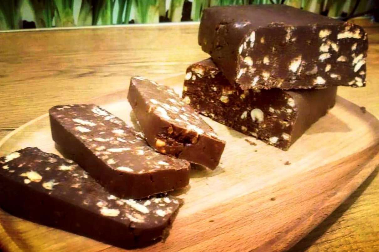 Masło, cukier, mleko i kakao zagotować do rozpuszczenia cukru, przelać do miski i stopniowo dodawać mleko w proszku, miksując na średnich obrotach. Na koniec dorzucić do masy pokruszone herbatniki i orzechy. Zawartość wyłożyć na pokrytą papierem keksówkę i wyrównać. Wstawić do lodówki do całkowitego stężenia bloku.