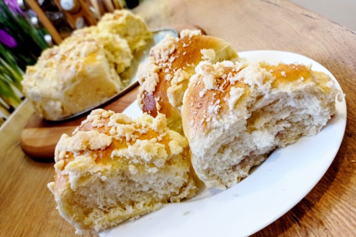Drożdże, cukier i 2 łyżki mąki wymieszać z ciepłym mlekiem, odstawić na 15 minut. Mąkę, sól, jajko i zaczyn wyrobić, dodać roztopione i wystudzone masło, wyrabiać na elastyczne ciasto ok. 10 minut. Ciasto przełożyć do miseczki, przykryć bawełnianą ściereczką, odstawić w ciepłe miejsce na godzinę do podwojenia objętości. Formować bułeczki – 10-12 szt. Nadziewać dżemem, uformować kulki i ułożyć na blaszce blisko siebie, zostawić na 20 minut do wyrośnięcia. W tym czasie ze składników na kruszonkę opuszkami palców wyrobić ciasto. Po upływie 20 minut uformowane kulki posmarować jajkiem, posypać kruszonką. Piec w temp. 190 st. C przez 30 minut.