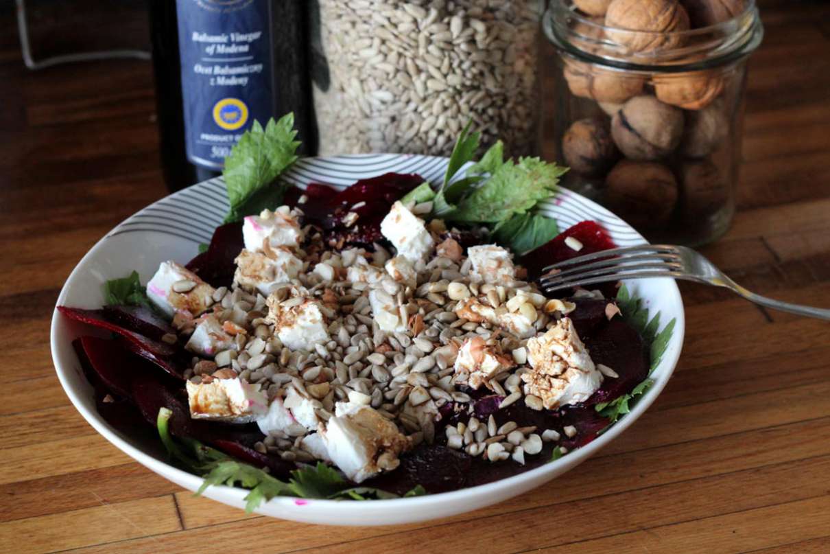 Upieczone buraki ścieramy na tarce w cienkie plasterki. Mieszamy wszystkie składniki na sos (najlepiej w zakręconym słoiku). Na talerzu układamy warstwę rukoli, następnie plasterki buraka i posypujemy kawałkami fety. Wierzch posypujemy rozdrobnionymi orzechami włoskimi i słonecznikiem. Całość polewamy sosem.