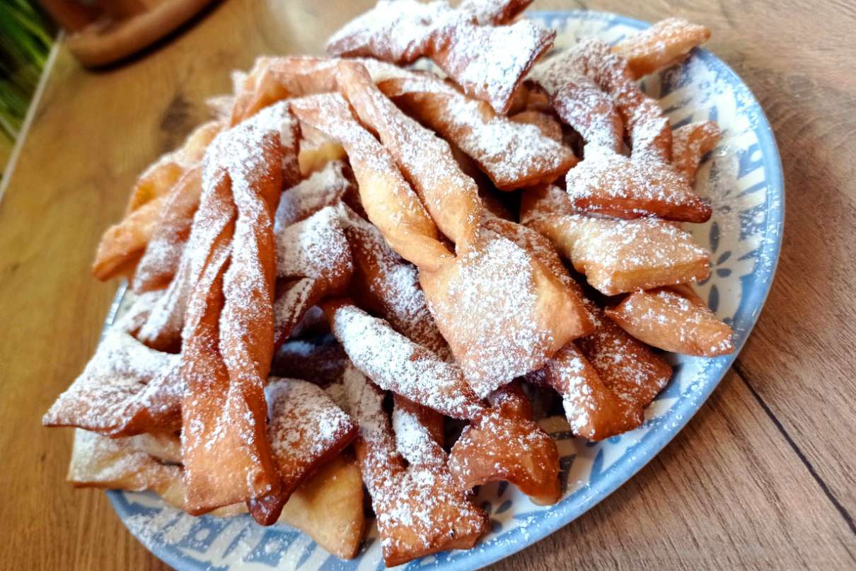 Ze wszystkich składników wyrobić ciasto i na 10 minut wstawić do lodówki. Rozwałkować cienko, ciąć w skośne paski, przecinać przez środek i przełożyć końce. Wrzucać na rozgrzany olej i piec. Po upieczeniu posypać cukrem pudrem.