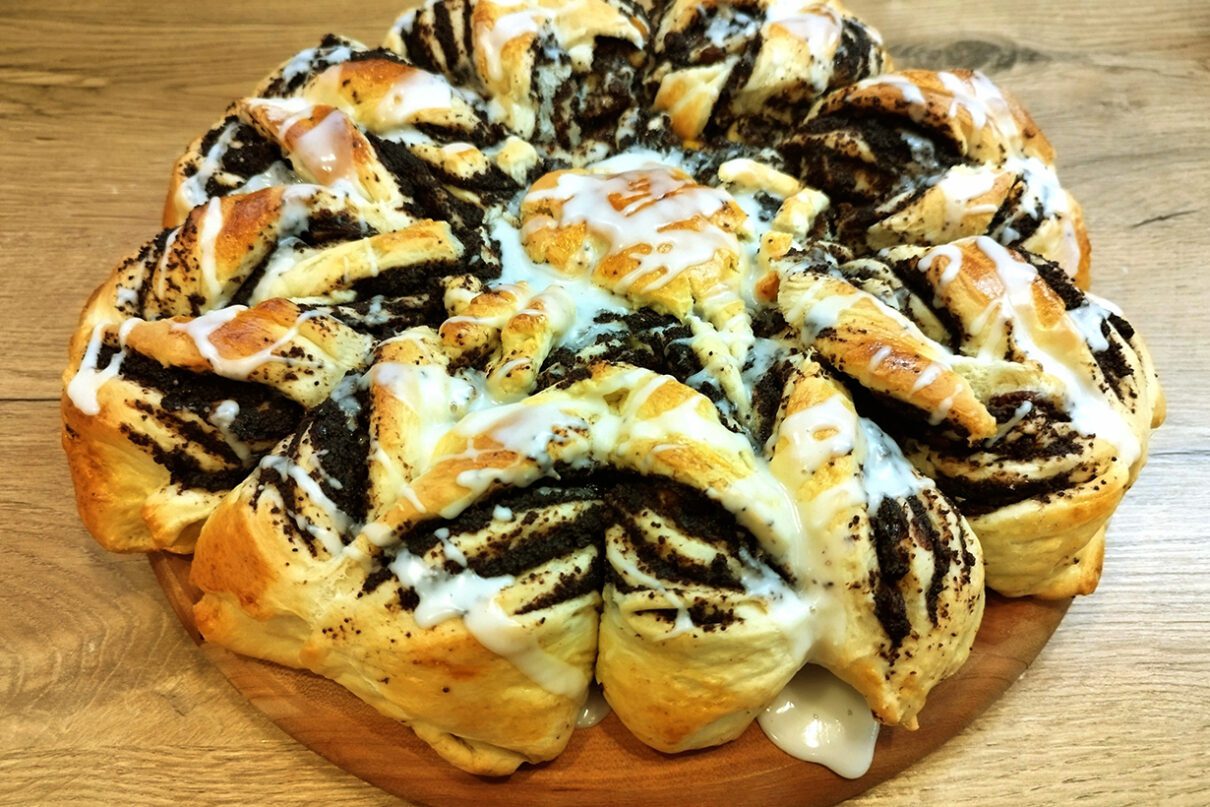 Do miski rozkruszyć drożdże, zasypać cukrem. Zalać ciepłym mlekiem i dokładnie wymieszać. Dodać 4 łyżki mąki, wymieszać by nie było grudek. Przykryć ściereczką i odstawić w ciepłe miejsce do wyrośnięcia na około 15 minut. Po tym czasie stolnicę wysypać pozostałą mąkę, dodać jajka, rozczyn, masło i zacząć wyrabiać ciasto. Robić to przez ok. 10-15 minut, aż ciasto będzie gładkie i elastyczne. Przykryć i odstawić na ok. 45 minut do wyrośnięcia. Po wyrośnięciu ciasto wyłożyć na stolnicę oprószoną mąką i chwilę je powygniatać. Uformować kulę, podzielić na 4 części. Pierwszy kawałek ciasta przez chwilę zagniatać, następnie rozwałkować na okrąg o średnicy ok. 25 cm. Położyć go na dużej blaszce wyłożonej arkuszem papieru do pieczenia. Rozsmarować 1/3 masy makowej, pozostawiając ok. 1 cm wolnego brzegu. Chwilę zagnieść i rozwałkować drugi kawałek ciasta, położyć go na pierwszym placku. Ponownie posmarować masą makową i położyć trzeci blat z ciasta. Posmarować resztą masy i przykryć ostatnim krążkiem. Ciasto pokroić na 16 części, nie docinając go do samego środka (pozostawić środek bez nacinania). Każdy kawałek okręcić dwa razy, parami na zmianę, tzn. jeden kawałek okręcić 2 razy w prawo, drugi sąsiadujący 2 razy w lewo. Przekręcone kawałki z każdej pary zlepić na końcu. Odstawić na ok. 20 minut do wyrośnięcia. Piekarnik nagrzać do temperatury 180 st. C. Wierzch ciasta posmarować roztrzepanym jajkiem i wstawić do nagrzanego piekarnika. Piec przez ok. 25 minut na złoty kolor. Wyjąć z piekarnika i po lekkim przestudzeniu polać lukrem (sok z cytryny wymieszać ze stopniowo dodawanym cukrem pudrem w takiej ilości, aby otrzymać gładką i jednolitą konsystencję).