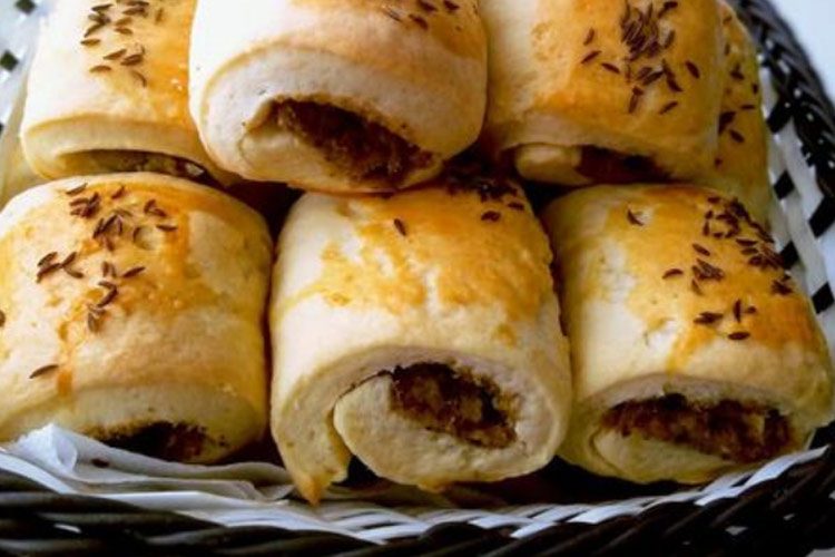Zetrzeć pieczarki na tarce i podsmażyć razem ze skrojoną w kostkę cebulką do momentu aż woda z lekka odparuje. Doprawić do smaku. Kiszoną kapustę pokroić drobno, podsmażyć na oleju, poddusić z pieczarkami i solidnie to całe towarzystwo doprawić. Do farszu można też dodać skrojony w kostkę podsmażony boczek lub kiełbasę. Na stolnicy wysypać mąkę z solą, dodać drobno posiekane masło. W kubku rozrobić drożdże z jogurtem i z łyżeczką cukru. Nie ma potrzeby czekać, aż drożdże wyrosną! Jogurt z drożdżami połączyć z mąką i masłem i wyrobić ciasto. Wyrobione ciasto rozwałkować, wzdłuż ciasta wykładać farsz z kapusty z pieczarkami i zawijać. Zwinięte w rulony ciasto z farszem kroić na mniejsze kawałki. Na posypanej mąką foremce wykładać pocięte kawałki ciasta, smarować niezbyt obficie rozkłóconym jajkiem i posypać kminkiem. Piec przez 15-20 minut w temperaturze ok 180/190 stopni. Doskonała przekąska zarówno na na ciepło do barszczu, jak i na zimno w formie drugiego śniadania.