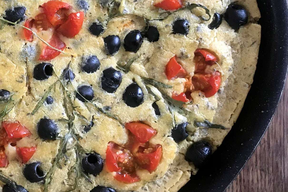 Przesiewamy mąkę z ciecierzycy do miski i stopniowo dodajemy wodę, mieszając. Dodajemy 3 łyżki oliwy, sól, pieprz. Mieszamy i odstawiamy na 2 godziny lub dłużej (ciasto powinno mieć konsystencję nieco gęstszą od naleśnikowego). Po tym czasie do ciasta wlewamy 3 łyżki oliwy i mieszamy. Wstawiamy do piekarnika patelnię dostosowaną do użycia w piecu i rozgrzewamy piekarnik do 240 stopni C (ok. 22 cm średnicy). Wyjmujemy rozgrzaną patelnię z piekarnika, natłuszczamy odrobiną oliwy i wlewamy ciasto. Na wierzchu rozkładamy oliwki i pomidorki oraz sezam. Wstawiamy patelnię do piekarnika i pieczemy ok. 15-20 minut, aż placek ładnie się zarumieni. Gotową farinatę najlepiej odstawić na 5-10 minut.
