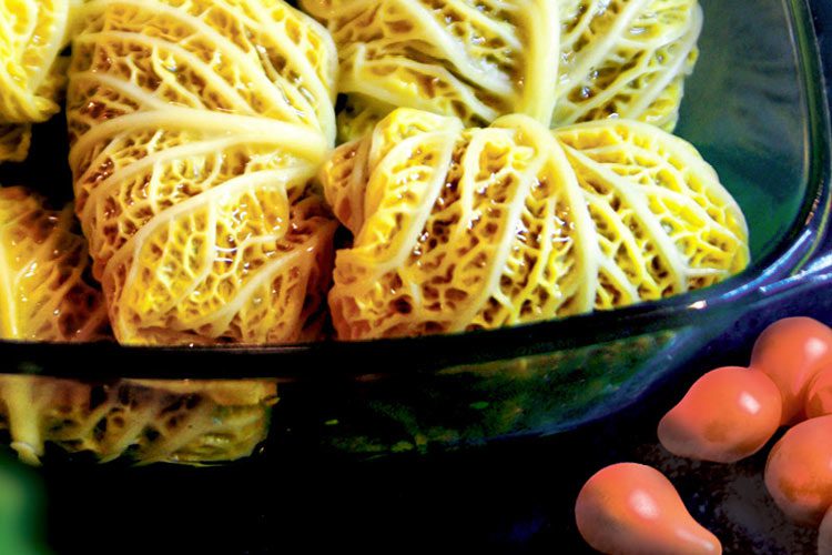 Przygotowujemy liście kapusty. W dużym garnku gotujemy wodę, gdy będzie się już gotowała zanurzamy pojedynczo liść na ok. pół minuty (aż stanie się elastyczny). Odkładamy do przestygnięcia. Grzyby siekamy na małe kawałki. Wodę z grzybów przelewamy do garnka. Cebulkę kroimy w drobna kostkę i smażymy do zarumienienia. Po tym czasie dodajemy grzyby i jeszcze chwilę podsmażamy. Doprawiamy do smaku solą, majerankiem i pieprzem. Kaszę i grzyby z cebulką mieszamy z surowym jajkiem. Do każdego liścia nakładamy ok. 3 łyżki farszu i zawijamy. Układamy w naczyniu żaroodpornym i wlewamy wodę po grzybach. Pieczemy w naczyniu żaroodpornym w 180 C przez 40-50 minut.