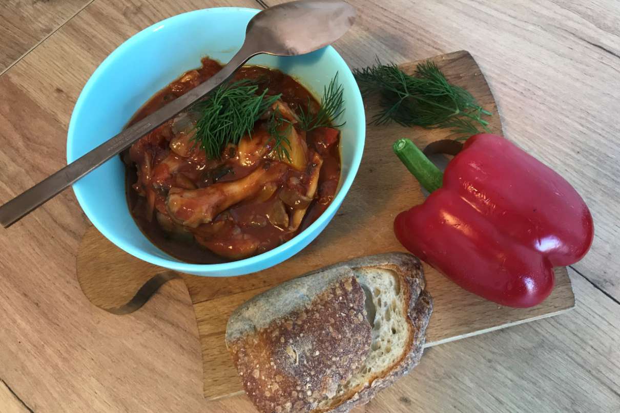 Kroimy drobno cebulkę, liść laurowy i ziele angielskie. Wrzucamy do garnka i podsmażamy. Następnie dodajemy pokrojoną w kostkę paprykę. Chwilkę podsmażamy. Boczniaki łamiemy na mniejsze kawałki i dokładamy do papryki. Wszystko razem mieszamy i smażymy przez kilka minut. Na końcu dodajemy wszystkie przyprawy oraz passate. Najlepiej smakuje z chlebem.