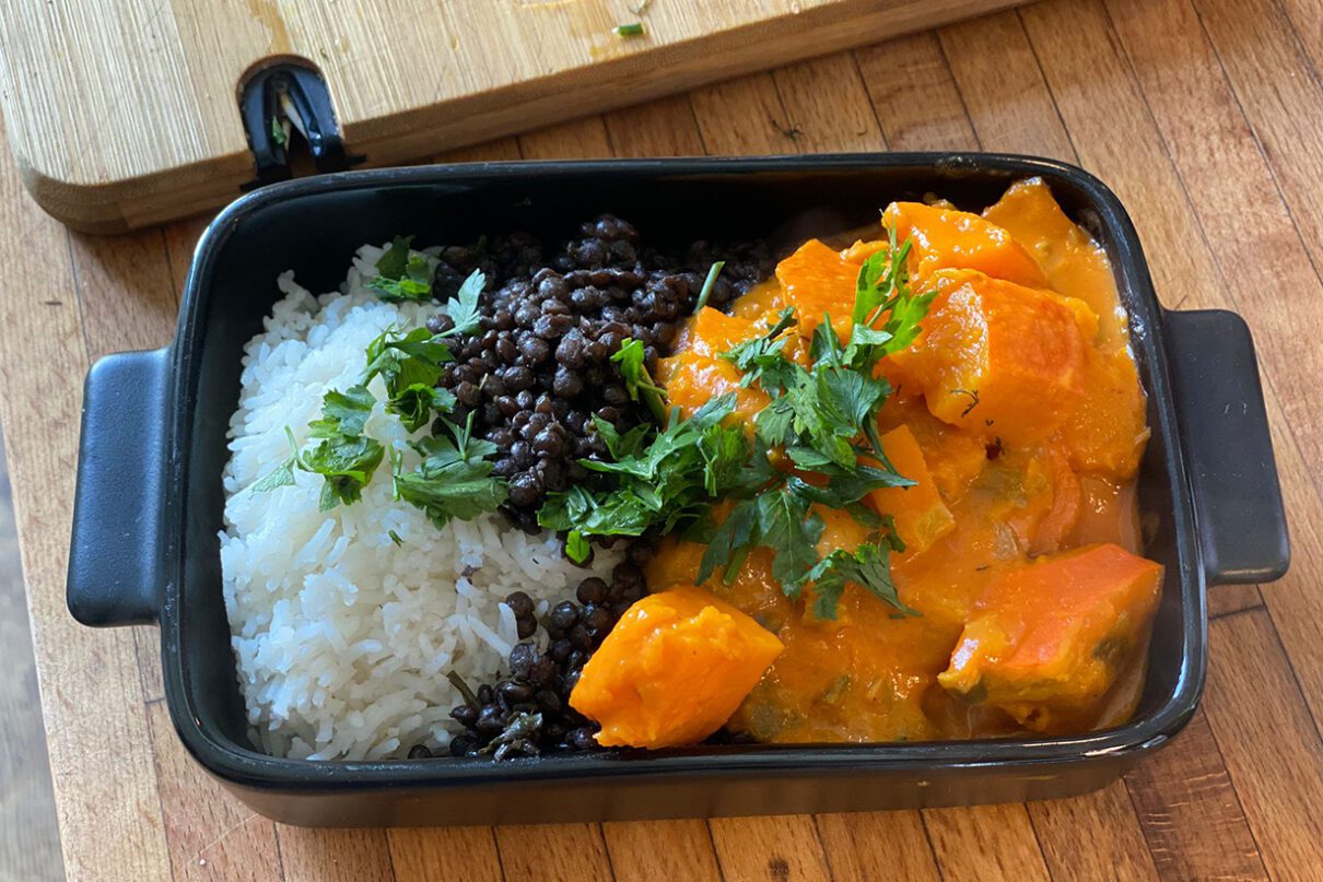 Dynie, bataty i marchew obrać i pokroić w dużą kostkę. Cebulę obrać i pokroić w kostkę, przełożyć do garnka i podsmażyć do zarumienienia. Dodać marchewkę i dalej smażyć. Następnie dodać dynię, bataty oraz przyprawy. Smażyć kilka minut. Dolać passatę i mleko kokosowe. Dusić około 20 minut bez przykrycia, często mieszając. Gulasz najlepiej smakuje podany z ryżem i posypany ulubionymi nasionami.