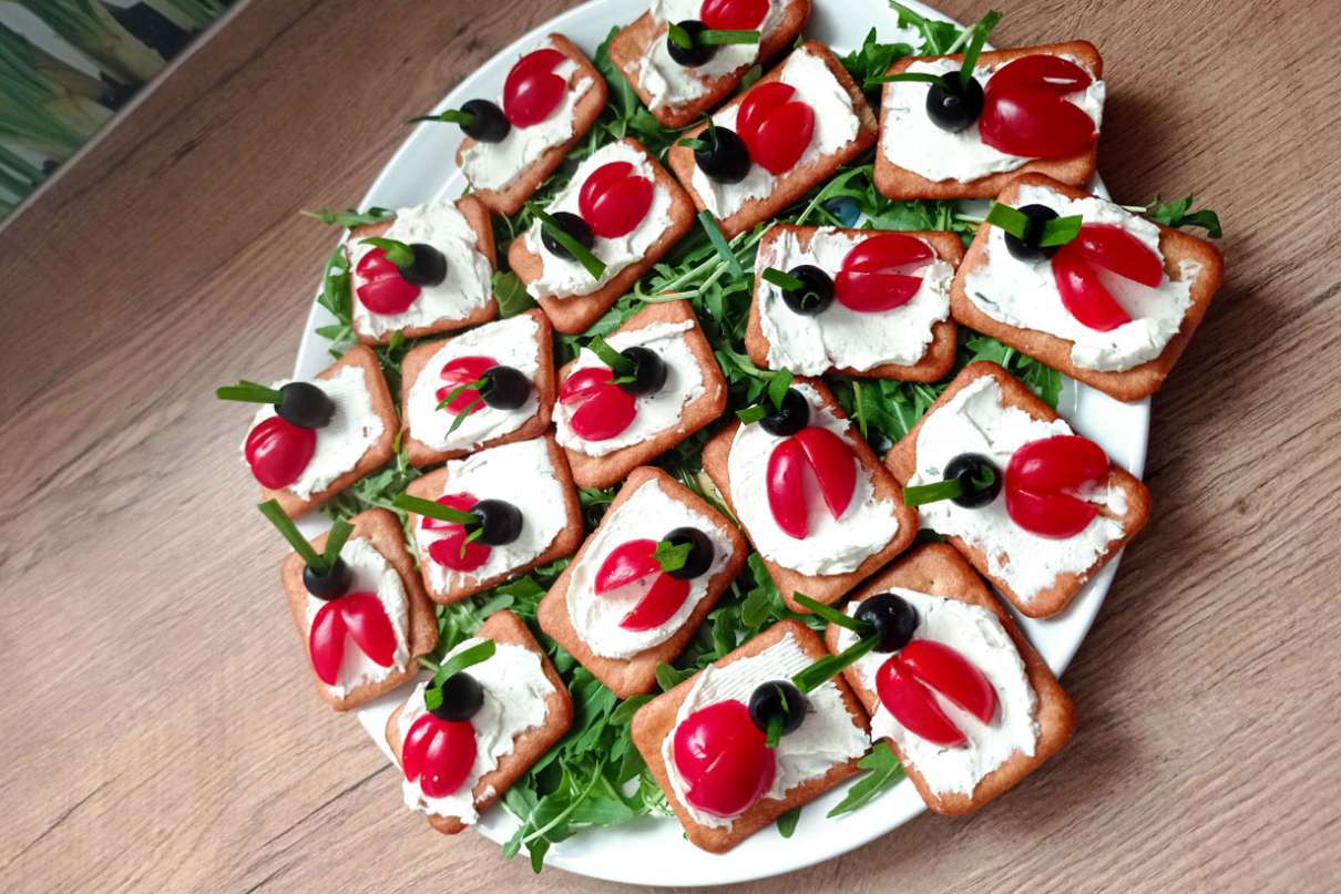 Krakersy posmarować serkiem. Pomidorki pokroić w ćwiartki. Na posmarowanych serkiem krakersach układać po dwie ćwiartki pomidorków koktajlowych i jedną czarną oliwkę odwróconą oczkiem do góry. W oczka oliwki wkładać po dwa około 2-centymetrowe szczypiorki. Opcjonalnie zamiast pomidorków i oliwek na posmarowanych serkiem krakersach można też układać po kawałku plasterka salami i listek rukoli.