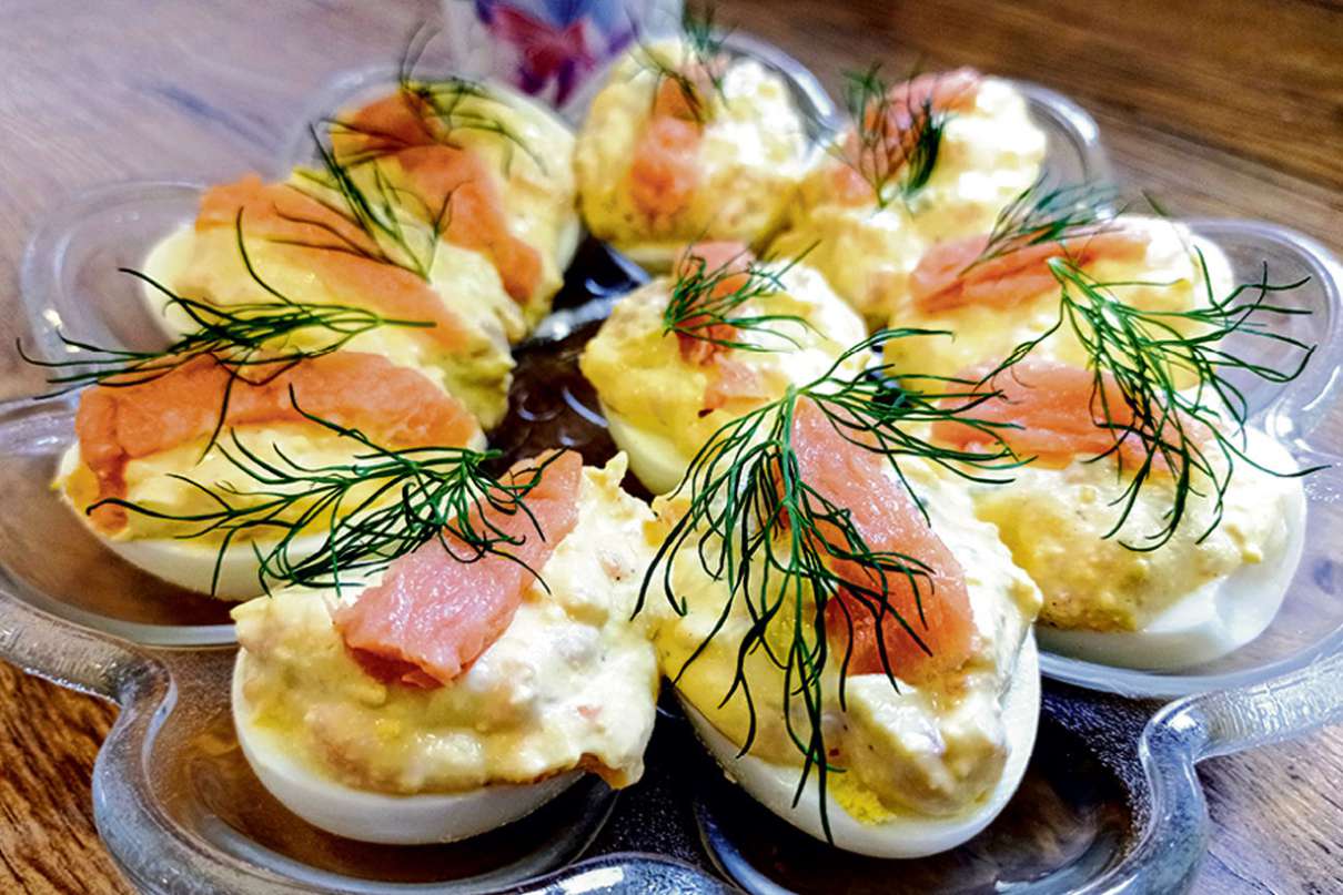 Jaja ugotować na twardo, obrać. Kawałeczek łososia odłożyć do dekoracji, resztę drobno posiekać. Jajka przekroić wzdłuż na połówki. Wyjąć żółtka, przełożyć do miski i rozgnieść widelcem. Dodać chrzan, łososia, serek i majonez. Razem wymieszać. Doprawić do smaku solą i pieprzem oraz sokiem z cytryny. Gotowym farszem napełnić połówki jajek, udekorować odłożonymi kawałkami łososia i koperkiem.