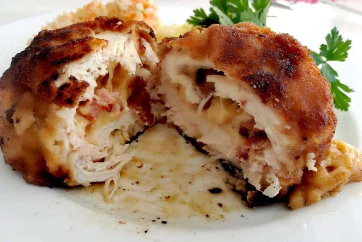 Filety wymyć, wysuszyć i przeciąć wzdłuż (na pół), delikatnie rozbić i doprawić, Boczek pokroić w kostkę, stopić i odlać tłuszcz. Ser żółty wymieszać ze skwarkami i doprawić do smaku. Na każdy plaster nałożyć farsz, zawinąć i uformować kształt kuli. Panierować w mące, roztrzepanym jaju i bułce tartej. Smażyć na głębokim tłuszczu do uzyskania złotego koloru. Usmażone kulki mocy zapiekać w piekarniku (w gęsiarce pod przykryciem) około 15/20 minut w 180 stopniach.
