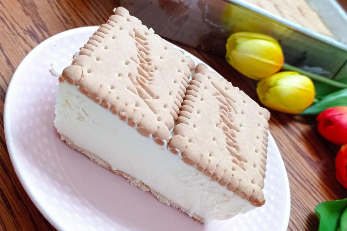 Ubić bitą śmietanę na sztywno, stopniowo wlewać słodkie mleczko z puszki cały czas mieszając. Wyłożyć brytfankę herbatnikami na spodzie, wyłożyć na herbatniki masę i wyrównać, na masę wyłożyć drugą warstwę herbatników. Włożyć do zamrażarki na minimum 7 godzin a najlepiej na całą noc. Kroić według uznania.
