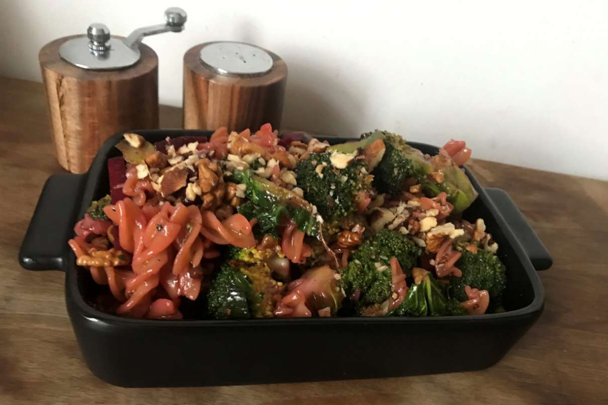 Makaron gotujemy do miękkości w osolonej wodzie. Brokuł dzielimy na różyczki i gotujemy ok. 10 minut. Upieczonego buraczka kroimy w paseczki lub drobną kostkę. Wszystkie składniki mieszamy i doprawiamy octem, miodem oraz solą i pieprzem. Na końcu posypujemy pokruszonymi orzechami.