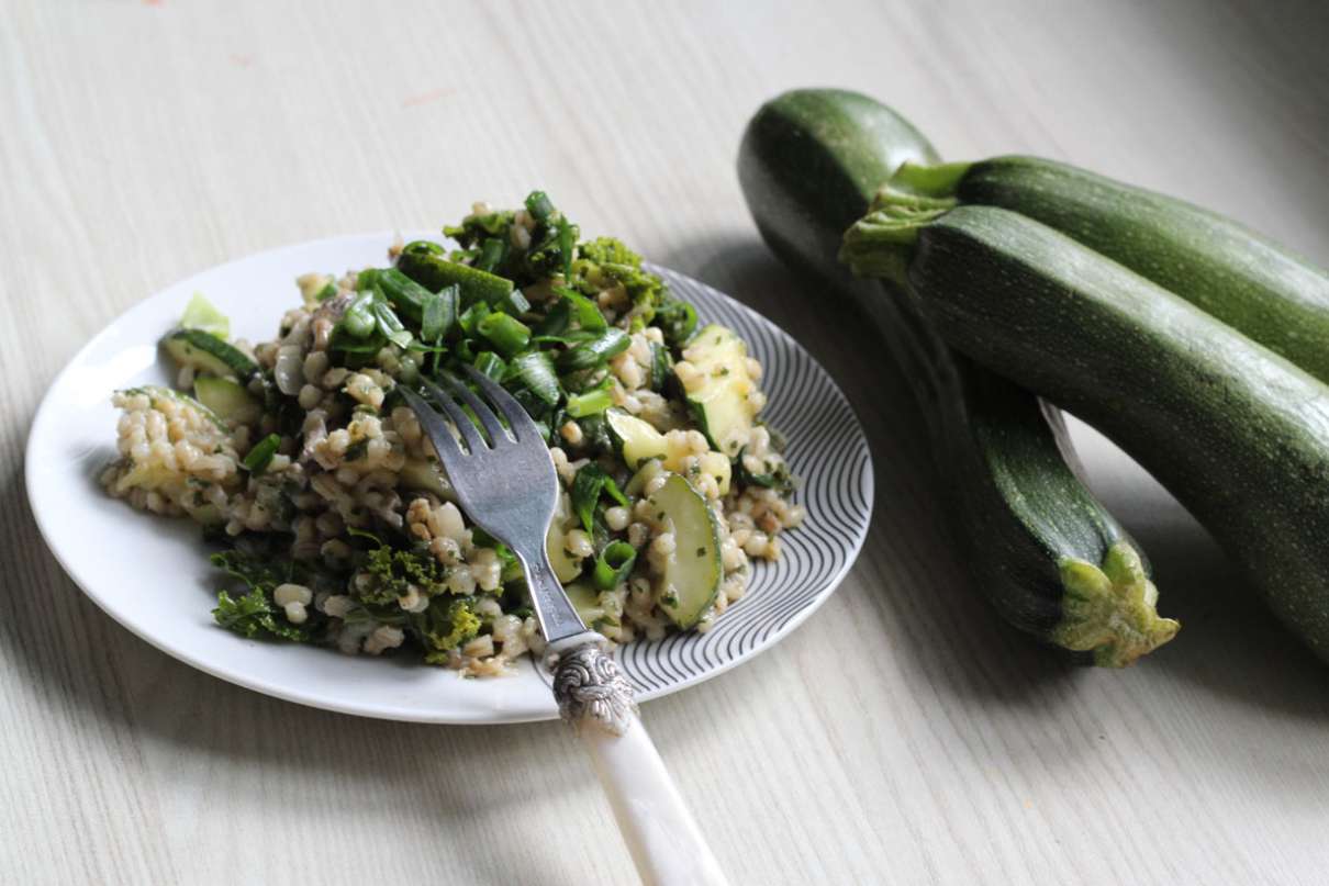 W głębokiej patelni np. typu wok rozgrzewamy oliwę. Dodajemy drobno pokrojonego pora oraz czosnek, podsmażamy przez kilka minut. Następnie dodajemy surową kaszę i chwilę podsmażamy. Zalewamy szklanką wina. Dusimy kilka minut, po czym dodajemy różdżki brokuła i dalej dusimy. Po 10 minutach dodajemy cukinię pokrojoną na plasterki. W razie potrzeby dodajemy pół szklanki wody. Na końcu doprawiamy solą, pieprzem oraz parmezanem. Podajemy ze świeżą pietruszką.