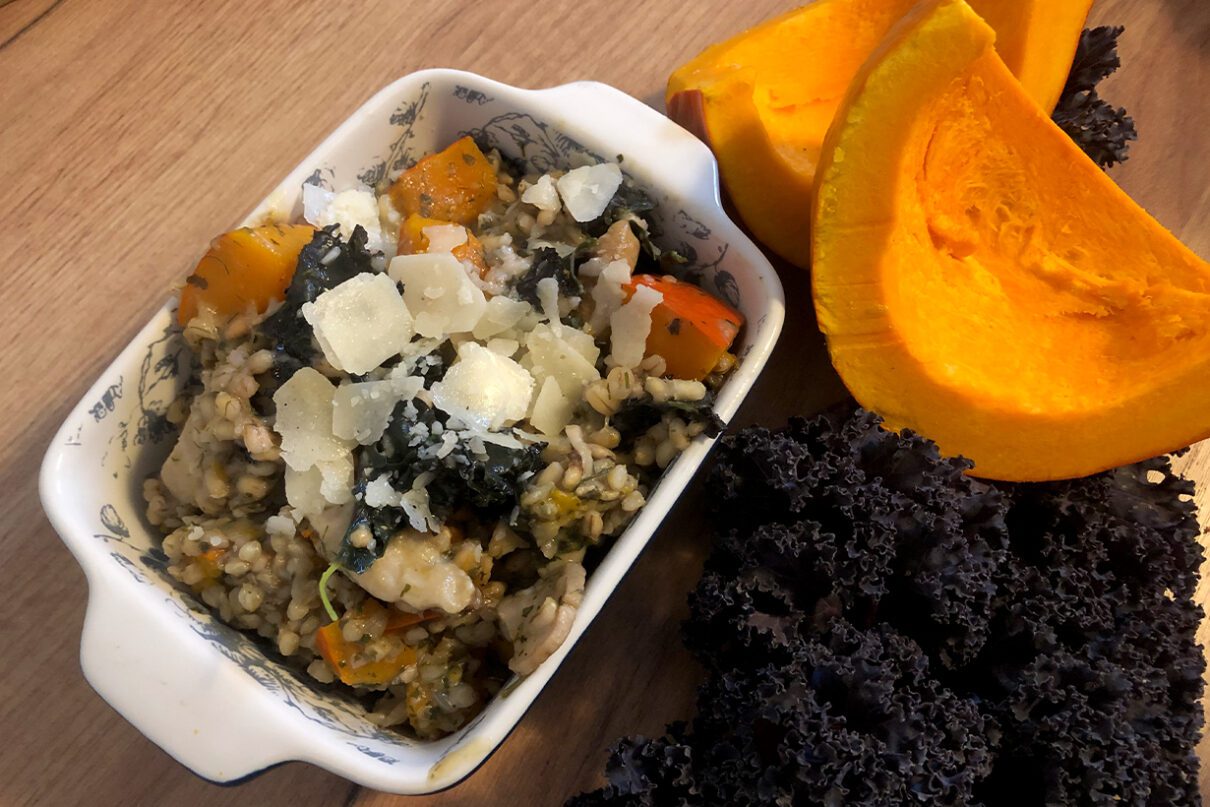 Cebulkę i czosnek obieramy i drobno siekamy. Dynię myjemy, wydrążamy z pestek i kroimy wraz ze skórką na mniejsze kawałki. Na głębokiej patelni lub w garnku rozgrzewamy masło. Dodajemy czosnek i cebulę, i smażymy do zarumienienia. Po tym czasie dodajemy surową kaszę i chwilę smażymy. Zalewamy bulionem, co jakiś czas mieszając. Po ok. 10 minutach dodajemy kaszę i dalej mieszamy. Na końcu dodajemy przyprawy, jarmuż i dalej smażymy do momentu, aż kasza i dynia będą miękkie. Na końcu dodajemy ser.