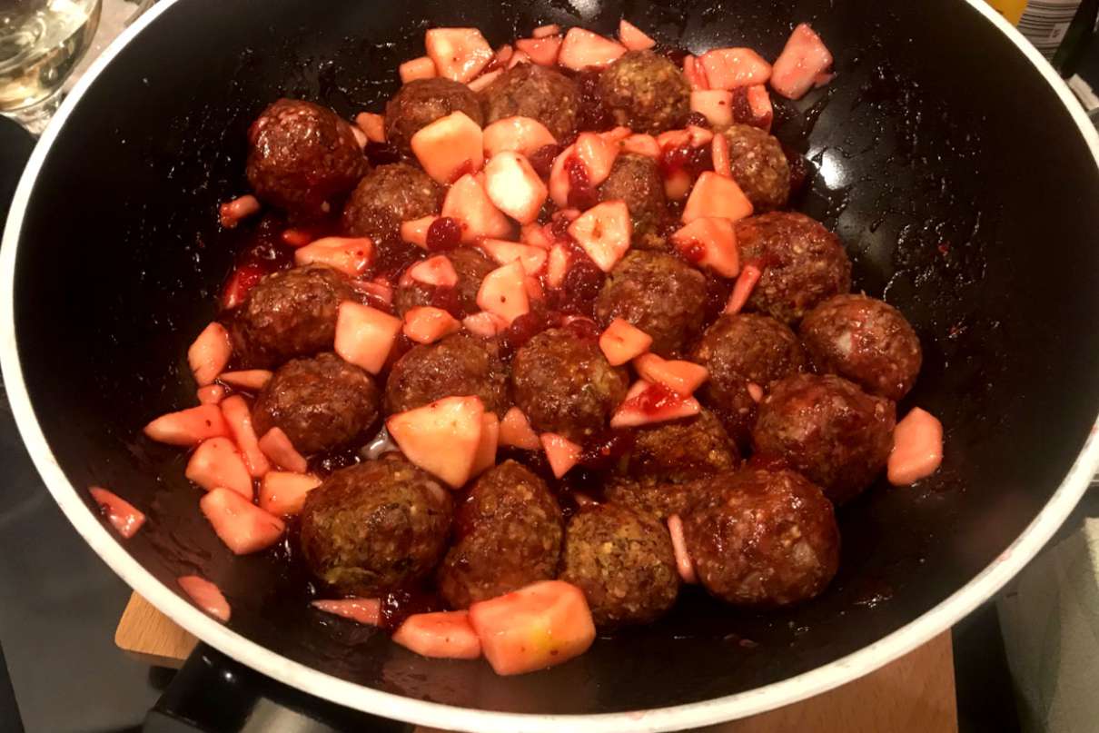 Cebulę siekamy bardzo drobno. Wszystkie składniki wkładamy do garnka lub dużej miski i wygniatamy na gęstą, zwartą masę. Doprawiamy solą, pieprzem i zielem. Na końcu blendujemy kilka razy i znów zagniatamy ponownie. Do małej miseczki wlewamy olej i lekko maczając w nim palce formujemy kuleczki (wielkości orzecha włoskiego). Pieczemy w temp. 200 st. C ok. 20 minut. Podajemy z gorącą żurawiną i jabłkami.