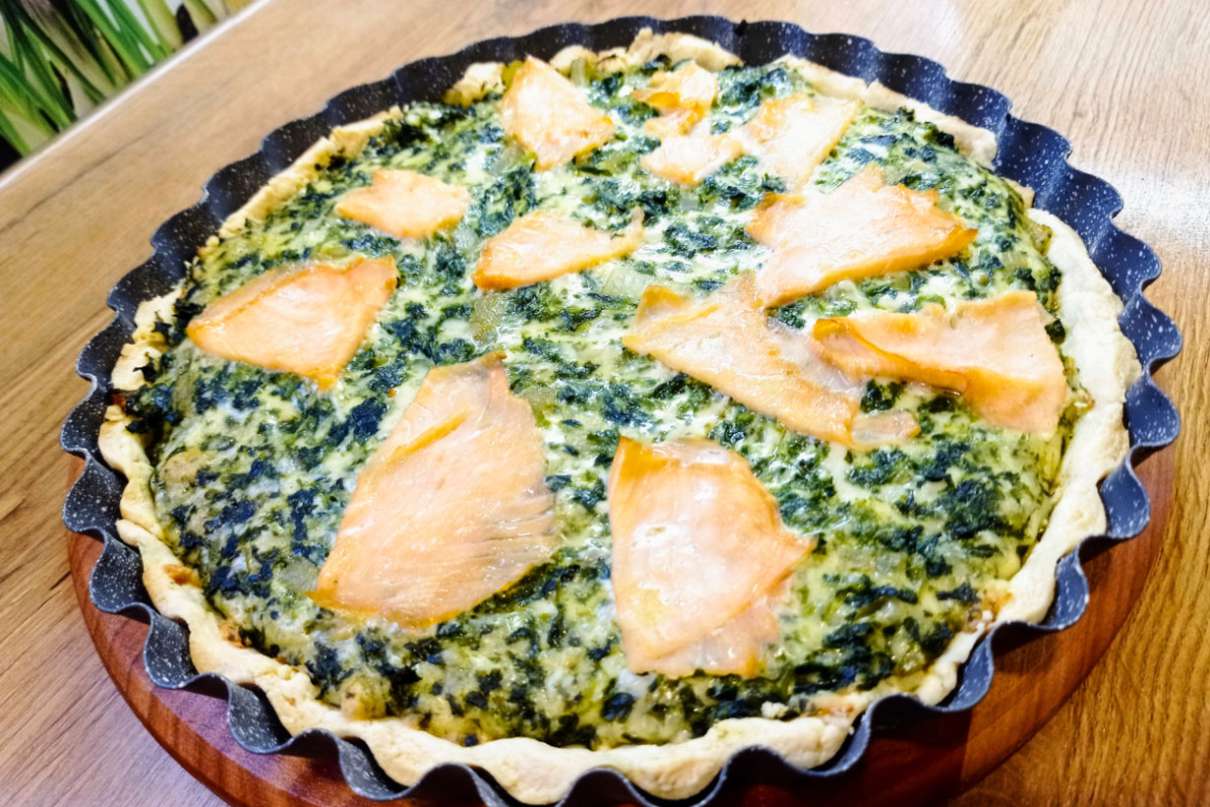 Mąkę przesiać, dodać sól, żółtko i masło, składniki posiekać. Dolać 2 łyżki zimnej wody, szybko zagnieść ciasto. Zawinąć je w folię, włożyć na 30-60 minut do lodówki. Ciasto cienko rozwałkować, wyłożyć nim formę do tarty, ponakłuwać je widelcem. Piec ok. 15 minut w temp. 180°C. Przygotować nadzienie. Cebulkę skroić w kostkę i poddusić na patelni na oleju. Dorzucić szpinak i przeciśnięty przez praskę czosnek, dusić aż woda odparuje. Ser zetrzeć na tarce o dużych oczkach. Zamieszać ze szpinakiem. Doprawić do smaku. Podpieczony spód wyłożyć szpinakowo-serowym nadzieniem i ułożyć łososia w dowolny sposób. Łososia posmarować delikatnie oliwą z oliwek, aby za bardzo nie wysechł. Quiche piec jeszcze ok. 25 minut w temp. 180°C.