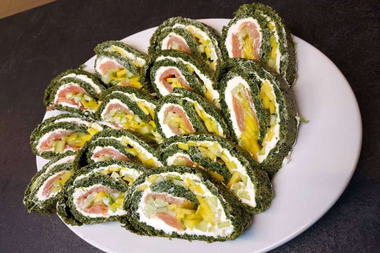 Szpinak podsmażamy na maśle lub oliwie. Doprawiamy solą, pieprzem, gałką. Pod koniec dodajemy przeciśnięty przez praskę czosnek. Odstawiamy do przestygnięcia, a następnie blendujemy na w miarę gładką masę. Oddzielamy białka od żółtek. Białka ubijamy na sztywną pianę. Do piany białkowej dodajemy po trochu (mieszając szpatułką) żółtka, mąki oraz przestudzonego zblendowanego szpinaku. Ciasto szpinakowe rozsmarowujemy na papierze do pieczenia i pieczemy około 15-17 minut w temperaturze 170 st. C. Następnie przekładamy na czystą deskę i delikatnie zdejmujemy papier. Odstawiamy do ostygnięcia. Ogórka oraz mango obieramy i kroimy w paseczki. Na wystudzonym cieście rozsmarowujemy serek i układamy łososia, ogórka i mango. Rolujemy dość ściśle i schładzamy w lodówce przez minimum 1 godzinę.