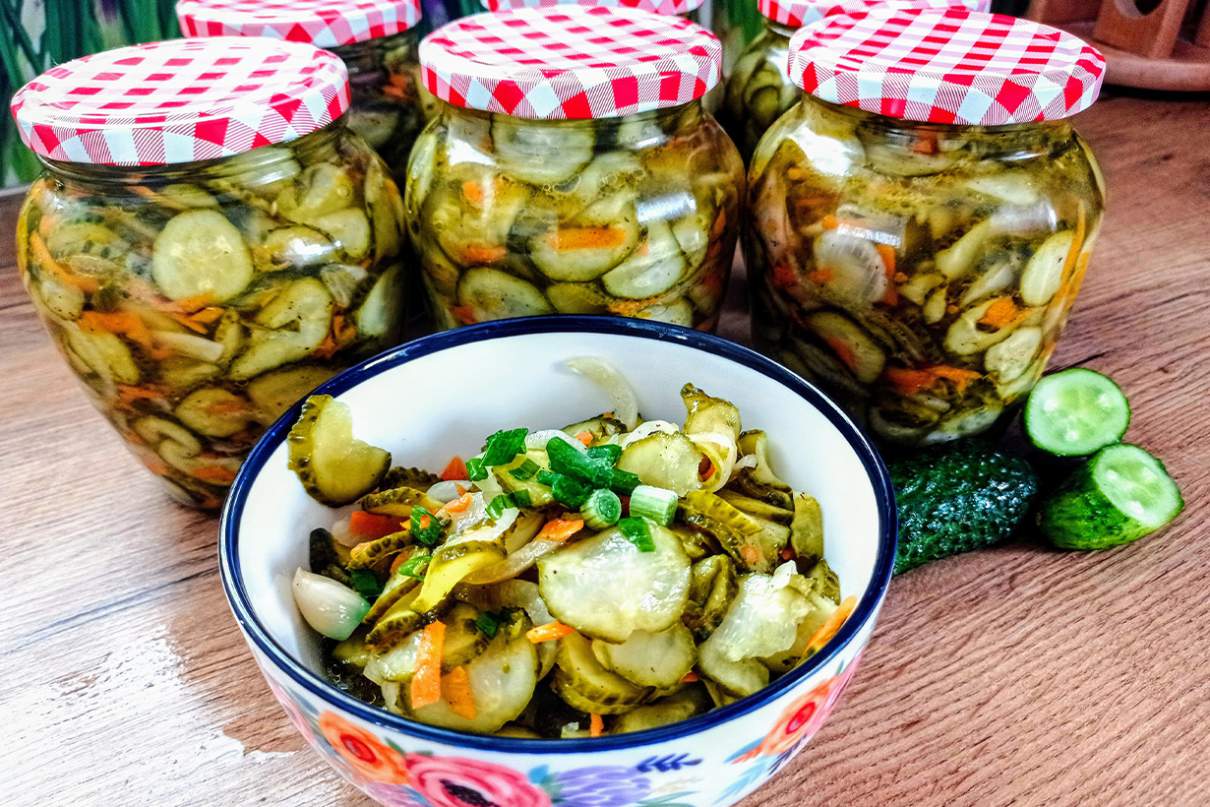 Ogórki umyć i poszatkować w plastry. Cebulę pokroić w piórka. Marchewkę obrać i zetrzeć na tarce o grubych oczkach. Czosnek obrać i dodawać w całości. Ogórki, marchewkę, cebulę i czosnek połączyć razem i dobrze wymieszać. Na końcu dodać cukier, olej, ocet, sól i pieprz. Wszystkie składniki jeszcze raz dokładnie wymieszać i odstawić na 2 godziny. Po 2 godzinach sałatkę przełożyć do słoików, porządnie ugniatając. Na wierzch można wylać troszkę zalewy. Słoiki zakręcić i pasteryzować przez 15 minut od zagotowania wody. Po ugotowaniu słoiki obrócić do góry dnem do wystygnięcia.