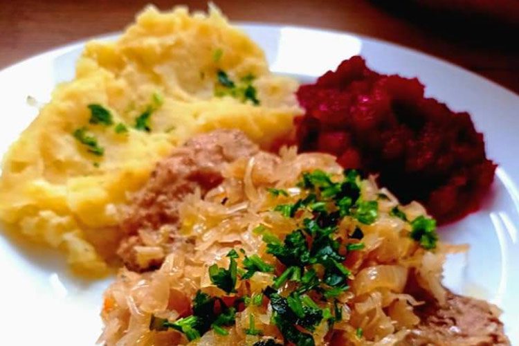 Schab pokroić na plastry, rozbić tłuczkiem. Doprawić przeciśniętym przez praskę czosnkiem, majerankiem, kminkiem i zmielonym pieprzem. Przed samym smażeniem doprawić solą. Po podsmażeniu mięsa, na tej samej patelni zeszklić i posolić pokrojoną w kosteczkę cebulę. Dodać kiszoną kapustę, listki laurowe i ziela angielskie. Mieszając smażyć kapustę przez ok. 2 minuty. Piekarnik nagrzać do 180 stopni C. Wyłożyć połowę kapusty do żaroodpornej formy, następnie położyć plastry schabu, znów położyć kapustę. Naczynie przykryć pokrywą lub podwójną warstwą folii aluminiowej. Wstawić do piekarnika i piec przez ok. 1 godzinę i 15 minut. Na koniec zdjąć pokrywę i zapiekać danie jeszcze przez ok. 10 minut w 220 stopniach.