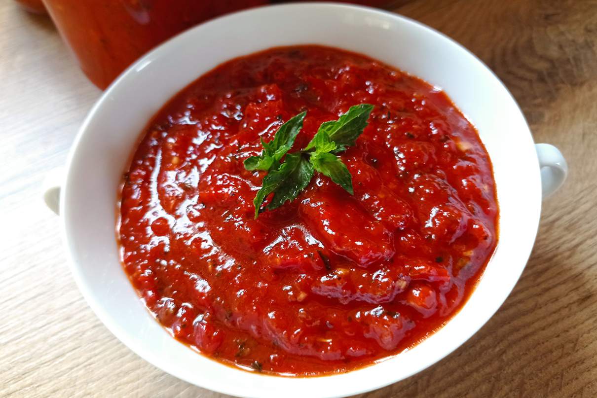 Paprykę zmielić w maszynce do mięsa. Dodać składniki (olej, sól, cukier) – gotować 20 minut na wolnym ogniu, często mieszając. Zdjąć z ognia, dodać czosnek przeciśnięty przez praskę, koncentrat pomidorowy, ocet i bazylię, zagotować. Gorący sos przełożyć do słoików. Słoiki zakręcić i pasteryzować przez 10 minut od zagotowania wody. Po ugotowaniu słoiki obrócić do góry dnem do wystygnięcia.