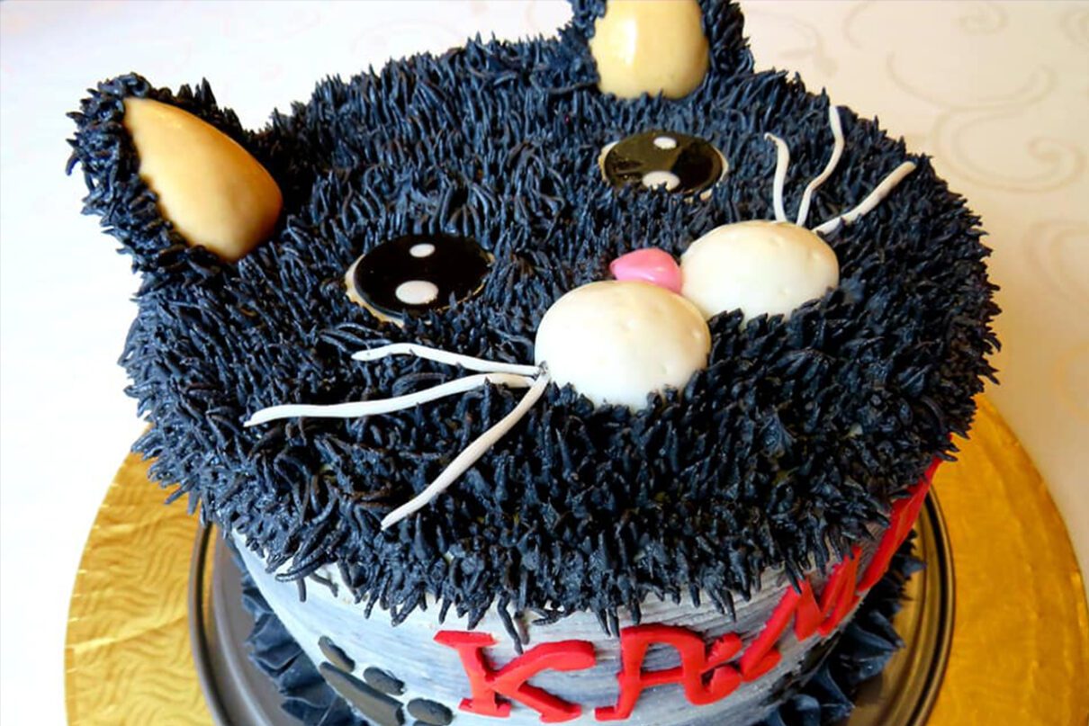 Mleko zagotować z cukrem i wanilią. Ostudzić. Masło ubić mikserem do białości przez ok. 10 minut. Dodawać porcjami ostudzone mleko, na koniec dodać mleko w proszku. Krem podzielić na dwie części. Do jednej dodać odrobinkę czarnego barwnika, by uzyskać jasnoszary kolor. Tym obłożyć boki tortu. Do drugiej części dodać tyle czarnego barwnika, aby uzyskać mocno czarny kolor. Czarny krem przełożyć do worka cukierniczego z tylką do tak zwanej trawy o numerze 233. Zrobić futerko na górze tortu. Z masy cukrowej przygotować buźkę kota, oczy i uszy. Umieścić odpowiednio na futerku. Po bokach ułożyć przygotowane wcześniej ‒ również z masy cukrowej ‒ łapki kota. Gotowy tort schłodzić w lodówce.