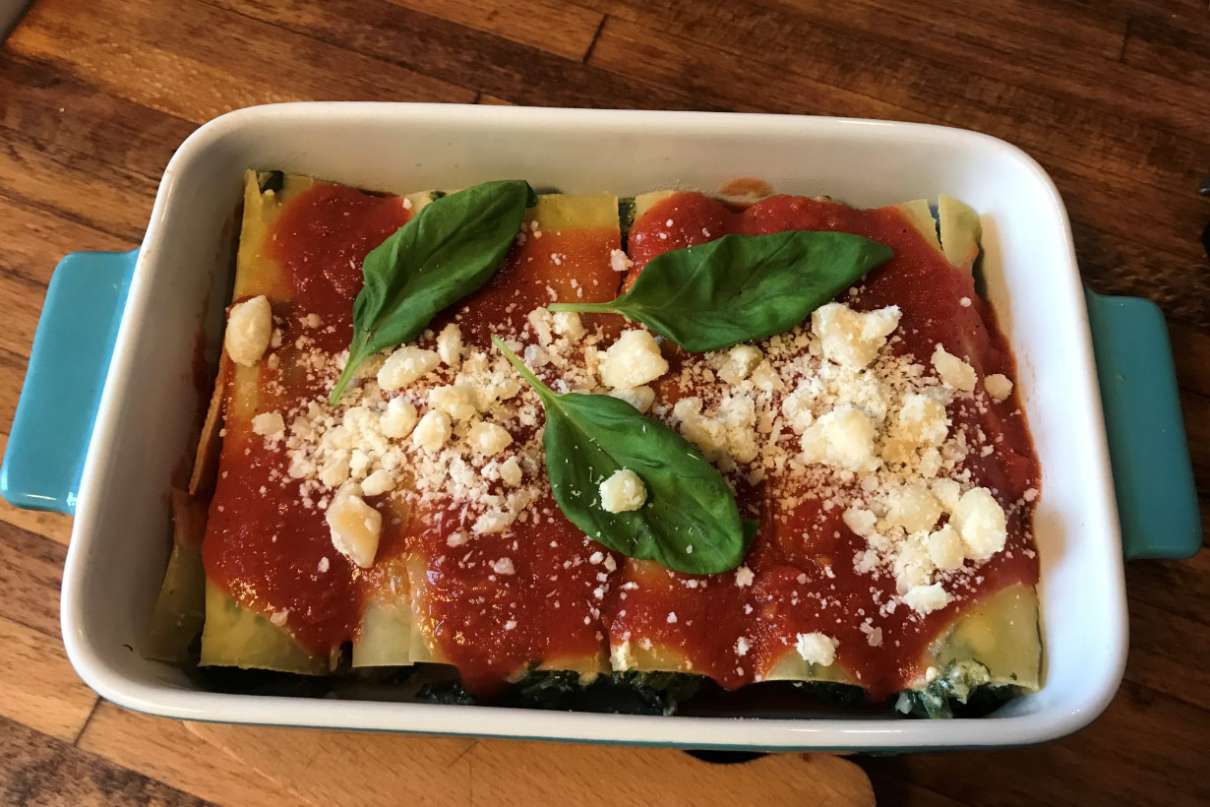 Cebulkę wraz z czosnkiem drobno kroimy i podsmażamy na oliwie. Do cebuli dorzucamy szpinak i dusimy przez ok. 10 minut. Doprawiamy solą i pieprzem. W tym samym czasie kruszymy fetę i dorzucamy do szpinaku. Surowy makaron nadziewamy szpinakiem (za pomocą łyżeczki). Układamy w brytfance lub naczyniu żaroodpornym jeden obok drugiego. Wierzch zalewamy passatą i doprawiamy solą oraz pieprzem. Posypujemy parmezanem i pieczemy przez 20 minut w temp. 200 C.